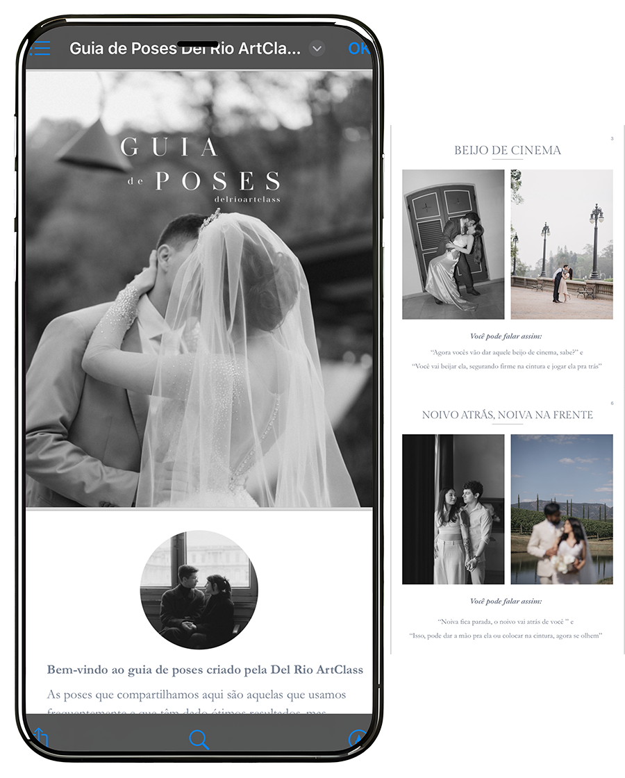 Nunca mais fique sem saber o que fazer no meio de um trabalho! Com o nosso guia de poses, você terá sempre uma inspiração à mão para manter o fluxo criativo e dirigir seus casais com confiança.